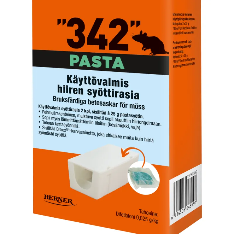 Pastasyötti hiirten torjuntaan sisätiloissa. Pakkauksessa on kaksi käyttövalmista syöttirasiaa. Kumpikin rasia sisältää 25 g hiirille maittavaa, pehmeää kasvipohjaisista aineksista koostuvaa tahnasyöttiä.