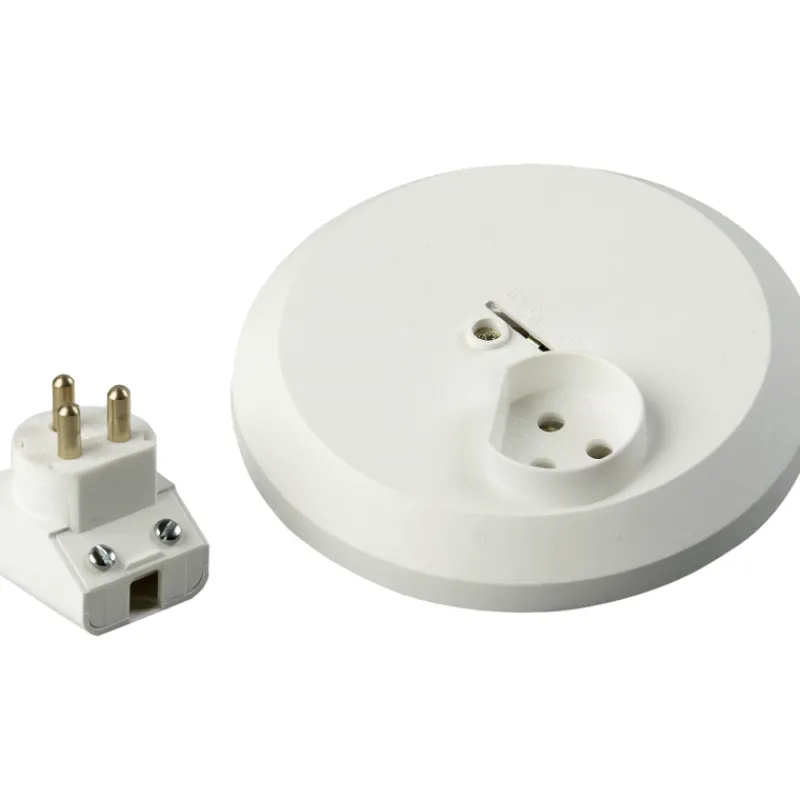 Kolmenapainen ABB valaisinpistorasia ( 6 A / 250 V) pinta- tai uppoasennukseen kuiviin sisätiloihin. Ripustuskoukun maksimikuormitus on 15 kg.
