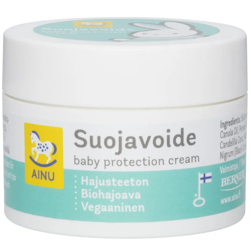 Ainu suojavoide hoitaa ja rauhoittaa vastasyntyneen vaippa-alueen herkkää ihoa. Se sopii myös monipuolisesti koko perheen ihonhoitoon. Sitä voi käyttää esimerkiksi paikallisesti ihon kuiviin kohtiin, ylähuulen rohtumiin sekä kuiville käsille. Vedetön voide sopii myös ulkoiluun.