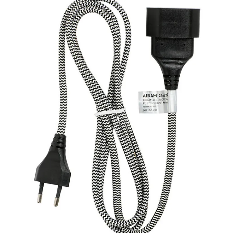 Kangaspäällysteisen jatkojohdon pinta on sik-sak-kuvioitua mustavalkoista tekstiilipunosta. 1-osainen, pituus 2 m. Lapsisuojallinen tuote. H03VVH2-F 2 x 0,75 mm².