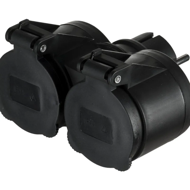 Ulkokäyttöön tarkoitettu 2-osainen haaroitin on varustettu läppäkansilla ja on roiskevesitiivis. Lapsisuojallinen tuote.