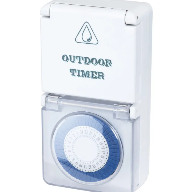 Sisä- ja ulkokäyttöön soveltuva ajastin, kotelointiluokka IP44. Jako 30 min (yksi painonasta on 30 min.) Lukuisia käyttökohteita, esim. auton lohkolämmittimen tai pihakoristevalojen automaattinen ajastaminen.