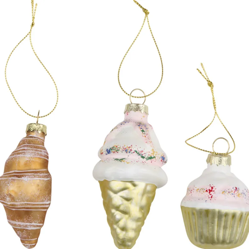Arti Casa -joulukoristeet poikkeavat piristävästi perinteistä! Pakkaus sisältää kolme herkkuteemaista koristetta: croissantin, jäätelön ja kuppikakun.