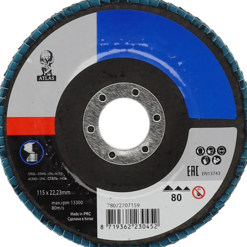 Atlas lamellilaikka 115×22.23mm kulmahiomakoneeseen. Zirkoni-hiomajyvä P80. Ihanteellinen akkukoneisiin.