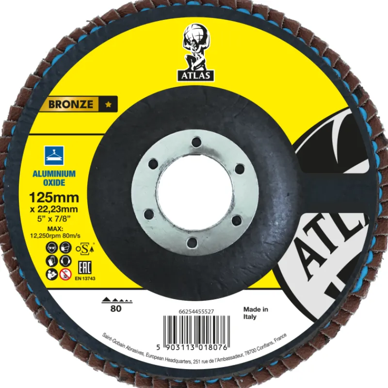 Norton Atlas lamellilaikka 125×22,23 mm kulmahiomakoneeseen. alumiinioksidi-hiomajyvä P80. Ihanteellinen akkukoneisiin. Soveltuu metalleille, puulle, karkeaan hiontaan.
