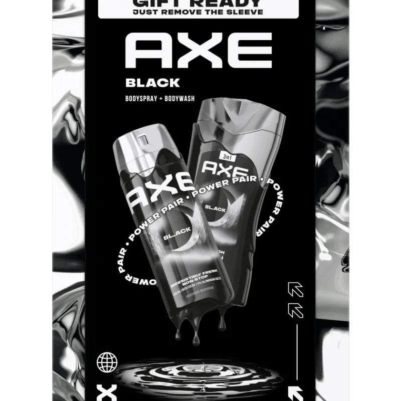 Axe Black -lahjapakkauksen tuotteet ovat yhdessä oikea voimapari! Pakkauksen virkistävä Deo Spray-suihkedeodorantti pitää olon raikkaana jopa 48 tunnin ajan. Spray sopii suihkutettavaksi sekä kainaloihin että vartalolle. Suihkugeelin maskuliininen tuoksu ja ylellisesti vaahtoava koostumus jättää peräänsä hyväntuoksuisen, puhtaan sekä pehmeän ihon.