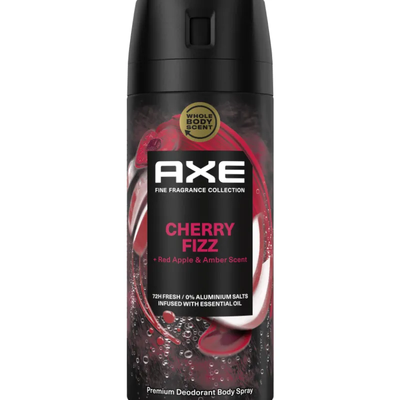 Axe 72h Fine Fragrance Cherry Fizz -deodoranttisuihke pitää hienhajun poissa pitkään ja tuo herkullisen kirsikan, punaisen omenan ja meripihkan tuoksuyhdistelmän käyttäjälle. Cherry Fizz -vartalosuihke sopii käytettäväksi myös vartalolla, eli muuallakin kuin vain kainaloissa. Sitä voi suihkauttaa esimerkiksi käsivarsien ja kainaloiden alle sekä koko ylävartalolle.