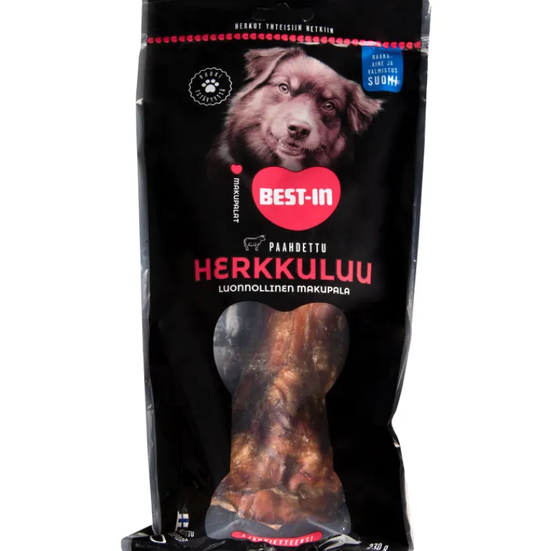 Best-In Herkkuluu on riittoisa naudanluu, josta riittä iloa ja pureskeltavaa koirallesi pitkäksi aikaa. Uunissa paahdettu Herkkuluu on valmistettu 100 % suomalaisista aineksista. Se sisältää ainoastaan suomalaisen naudanluun sekä luontaisen savuaromin.