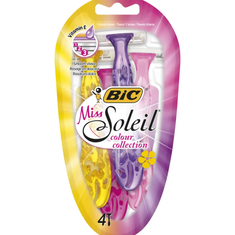 Elegantti BIC Miss Soleil Colour Collection -höylä on erinomainen valinta naisille, jotka haluavat sileää ja tarkkaa ihokarvojen ajelua. Kolmiteräinen teknologia ja E-vitamiinia sisältävä voidenauha tarjoavat saumattoman liu’un ja upeat tulokset säärissä, kainaloissa ja binikialueella.