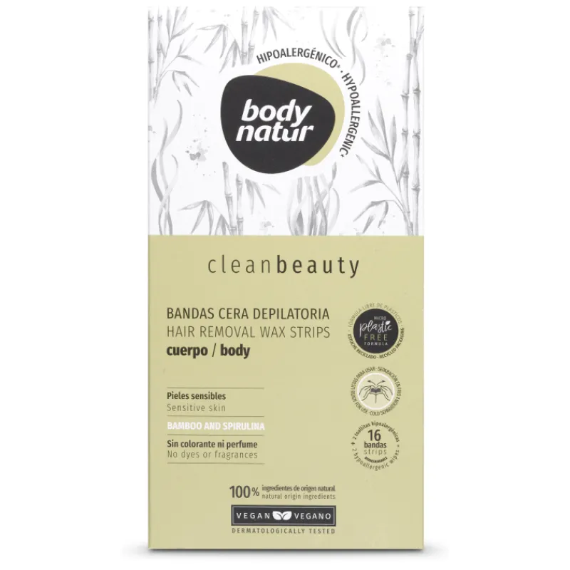 Body Natur -vahaliuskat ovat tarkoitettu ihonkarvanpoistoon vartalolta. Herkälle iholle sopivat vahaliuskat sisältävät rauhoittavaa bambua ja spirulinaa.