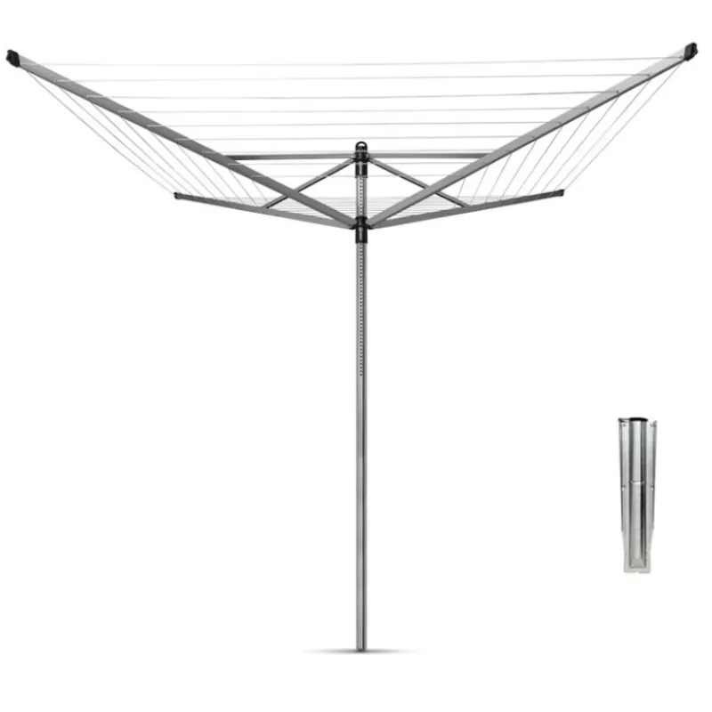 Erittäin käytännöllinen Brabantia Lift-O-Matic -pyykinkuivausteline 50 m. Kuivaustelineen runko on tukevaa ja säänkestävää alumiinia. Avaaminen ja sulkeminen on helppoa sateenvarjomenetelmällä, joka takaa myös aina kireät pyykkilangat. Teline pyörii kevyesti yläosastaan ja työskentelykorkeutta voi säätää (125-185 cm). Telineessä on mukana metallinen maaterä. Tuotteella 5 vuoden valmistajan takuu.