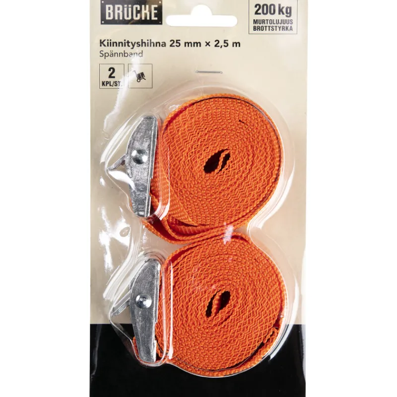 Oranssi Brücke-kiinnityshihna soveltuu erilaisten kuormien sitomiseen ja pitävään kiinnittämiseen. Liinan leveys 25 mm ja pituus 2,5 m. Taakkaliinan murtolujuus on 200 kg. Pakkauksessa on 2 kpl taakkaliinoja.