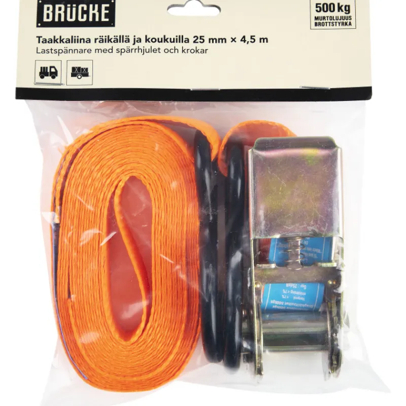 Räikällä ja koukulla varustettua Brücke-taakkaliinaa on nopea ja kätevä käyttää esimerkiksi kuorman sidonnassa. Murtolujuus 500 kg. Mitat 25 mm x 4,5 m.
