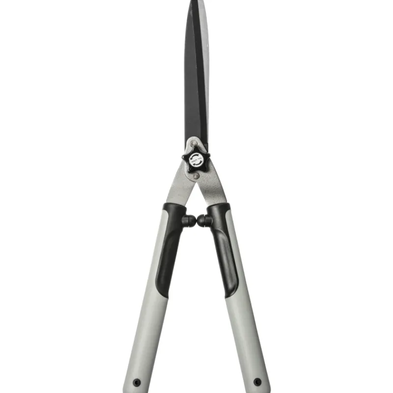 Tukevat pensassakset, joissa on leikkuujäljen säätöruuvi ja pehmustetut kädensijat. Saksien terän pituus on noin 20 cm ja kokonaismitta noin 55 cm.