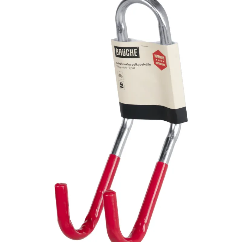 Brücke seinäkoukku polkupyörälle, materiaali terästä, PVC-pinnoitettu. Mitat 330 x 120 x 100 mm. PVC-suoja vähentää pyörän naarmuuntumista. Kantavuus max 40 kg. Pakkaus sisältää 2 kpl ruuveja ja tulppia..
