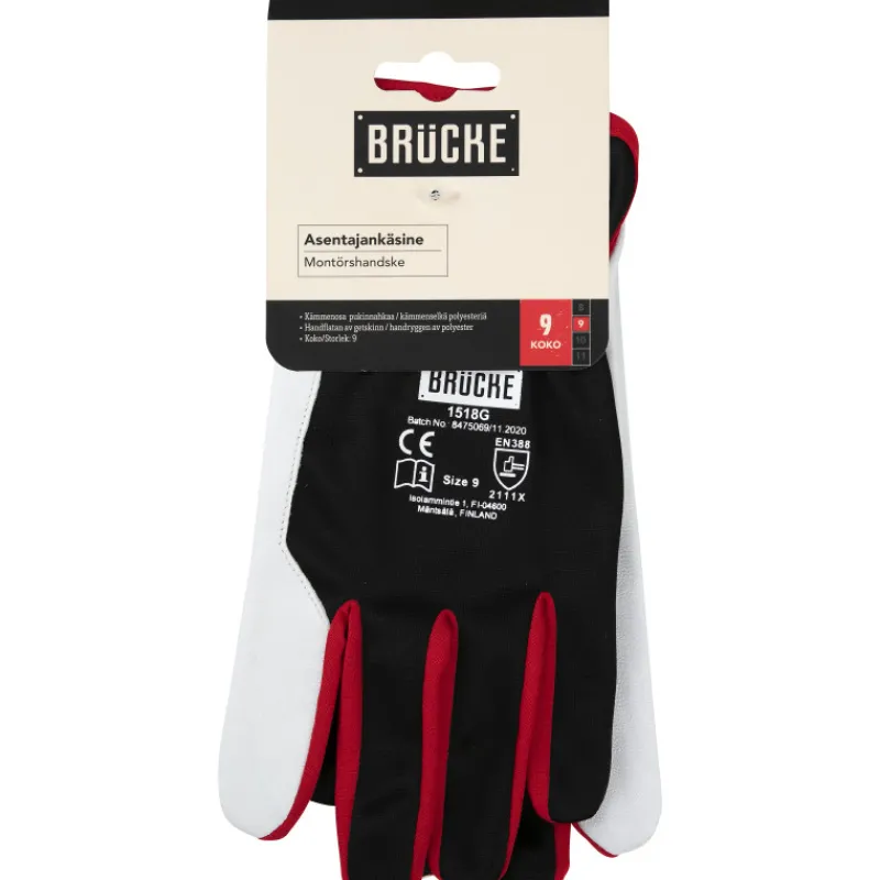 Brücke-asentajankäsineiden kämmenosa on pehmeää pukinnahkaa ja kämmenselkä polyesteriä. Käsineet kuuluvat suojausluokkaan II – vaativaan käyttöön – vain mekaanisia vaaroja vastaan. Koko 8.