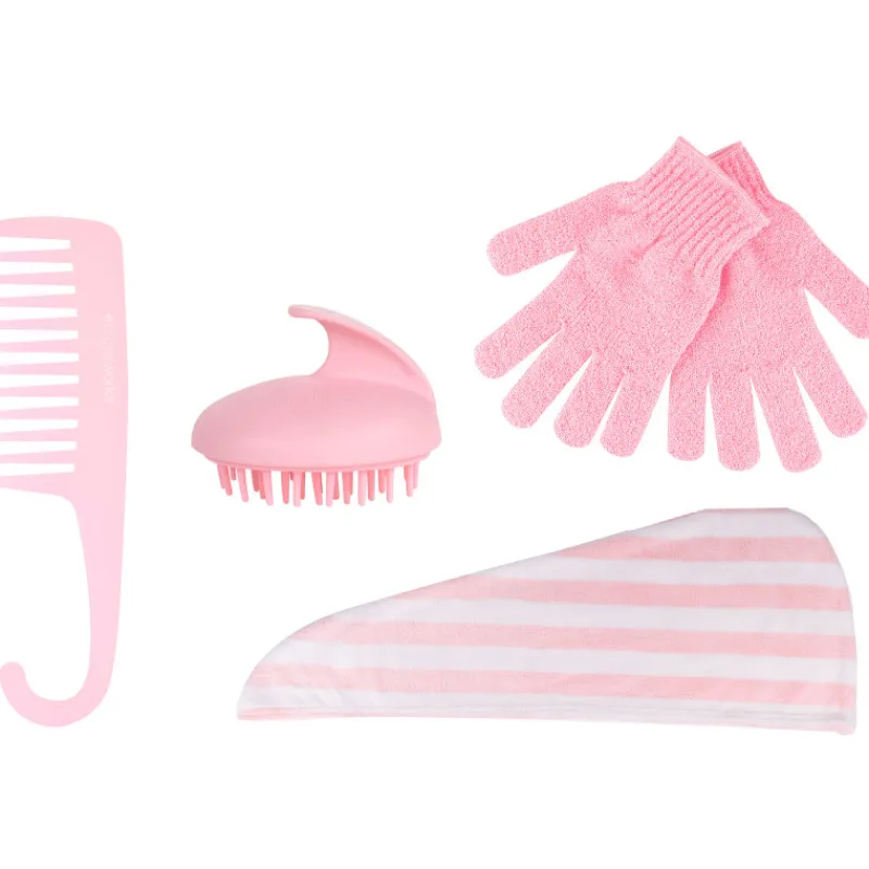 Leveähampaisen suihkukamman avulla levität hoitoaineen ja hiusnaamion tasaisesti hiuksiin. Kaarevan pään ansiosta kamman voi ripustaa suihku- tai shampootelineeseen. Valmistettu soft touch-materiaalista, joten kampa pysyy hyvin märissäkin käsissä suihkun ajan. Shampooharjan pehmeät silikoniset harjakset stimuloivat hiuspohjan verenkiertoa, ehkäisevät hiusten rasvoittumista ja hilseen muodostumista sekä puhdistavat hiuspohjan muotoilutuotteista. Ergonominen muotoilu helpottaa harjan pysymistä kädessä suihkussa. Kuorintahanskojen avulla kuorit vartalon ihon ihanan pehmeäksi ja valmistelet ihon hoitotuotteita sekä itseruskettavia varten. Nopeuta hiusten kuivumisaikaa pehmeästä mikrokuidusta valmistetun hiusturbaanin avulla, joka imee vettä jopa 5x nopeammin kuin tavallinen puuvillapyyhe ja estää hiusten katkeilua.