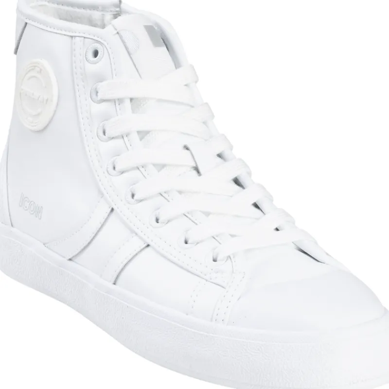 Naisten Coolway Icon-tennarit trendikkäällä, pidemmällä varsiosalla. Päällisen materiaali aitoa nahkaa, sisäpuolella on pehmeä fleecevuori ja paksu, irrotettava pohjallinen. Paksussa ulkopohjassa on kiva pitokuviointi.
