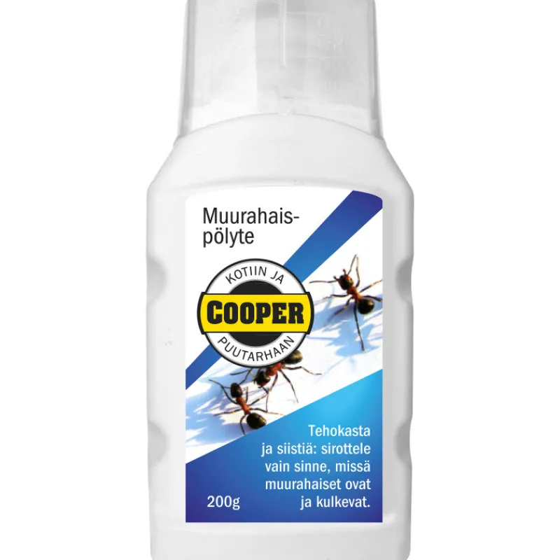 Cooper muurahaispölyte on tehokas ja siisti torjunta-aine muurahaisten torjuntaan sisätiloissa ja rakennusten välittömässä yhteydessä. Se on helppo sirotella vain sinne, missä muurahaiset ovat ja kulkevat. Se soveltuu muurahaisten, sokeritoukkien, pihtihäntäisten, kovakuoriaisten ja muiden ryömivien hyönteisten torjuntaan. Ei syötävien kasvien alustoille.