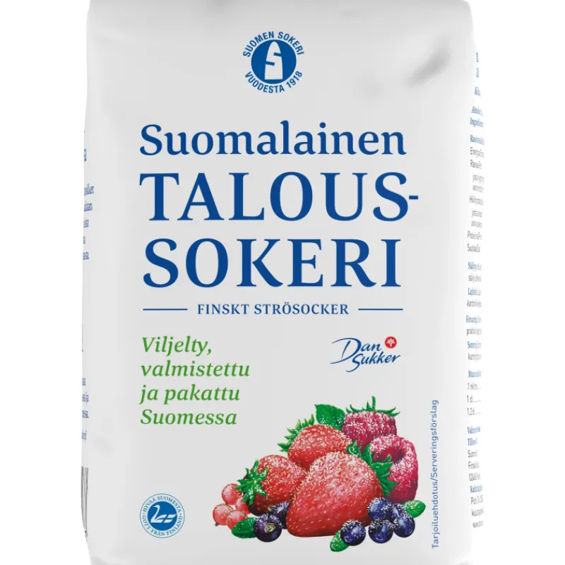 Suomalainen kidesokeri yleiskäyttöön. Taloussokeri on täysin kotimaisesta raaka-aineesta kotimaisella työllä valmistettu sokeri.