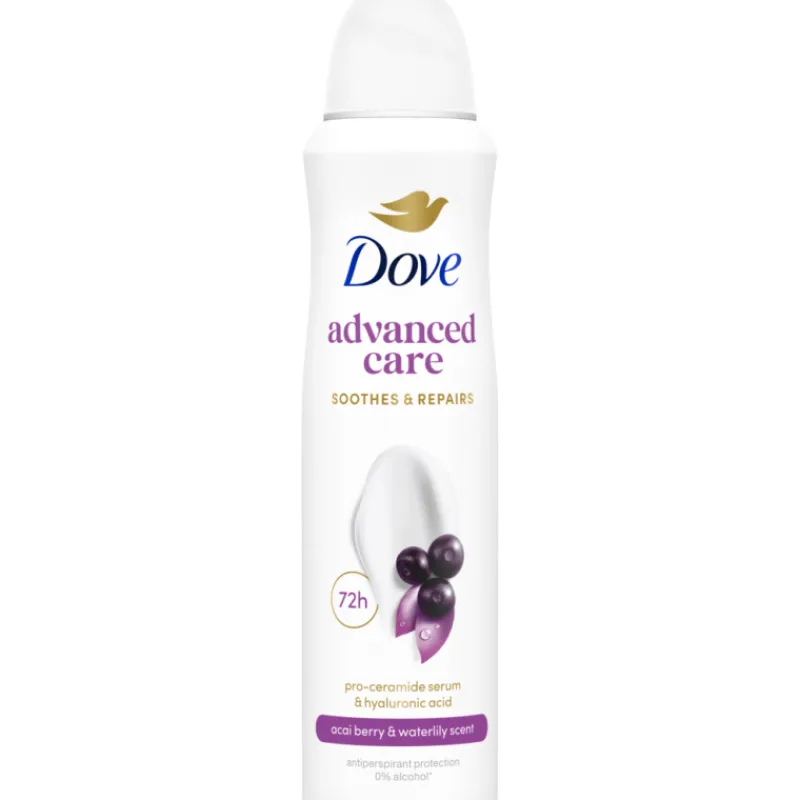 Dove Go Fresh Acai & Water Lily -antiperspirantti suojaa hikoilulta ja auttaa kainaloiden ihoa palautumaan ihokarvojen ajelusta. Siinä on ihon korjausjärjestelmää auttava pro-ceramide-teknologia sekä Dove-kosteusvoidetta, mikä auttaa pitämään ihon pehmeänä ja sileänä. Raikkaan hedelmäinen acai-marjojen ja lumpeen tuoksu.