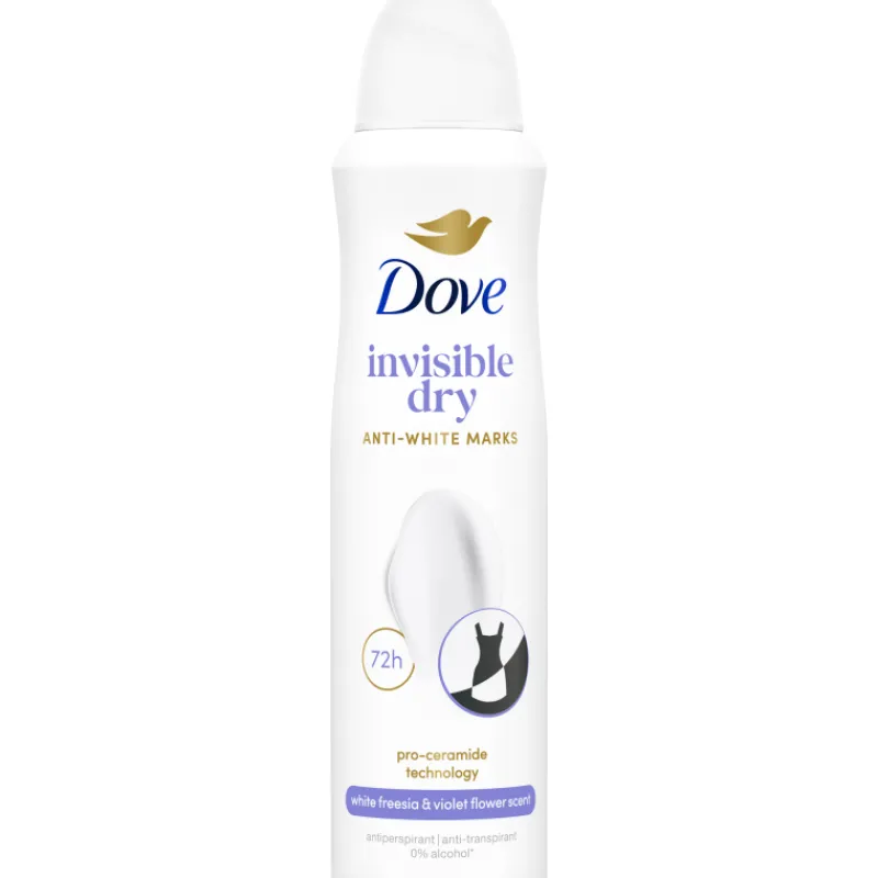 Dove Invisible Dry -deo spray antiperspirantin erityinen koostumus ei jätä vaatteisiin valkoisia tahroja. Se antaa pitkäkestoista suojaa hikoilua ja hajuja vastaan. Alkoholittoman deodorantin koostumuksessa on mukana kosteusvoidetta ja pro-ceramide-teknologia, joka säilyttää kosteuden syvällä ihossa. Antiperspiranttisuihke auttaa myös vähentämään kainalokarvojen ajamisen aiheuttamaa ihoärsytystä. Tuotteessa on mieto tuoksu.