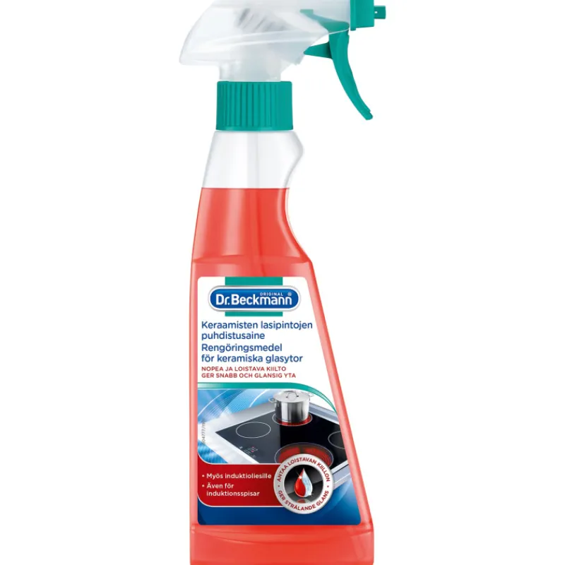 Keraamisten lasipintojen Dr. Beckmann -puhdistussuihke puhdistaa ja kiillottaa tehokkaasti kaikentyyppiset keraamiset lasipinnat. Se sopii hyvin myös induktioliesille sekä uunien ja takkojen laseille.