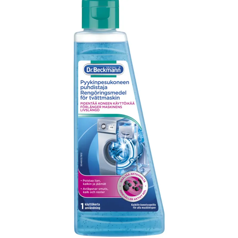 Dr Beckmann Pyykinpesukoneen tehopuhdistaja puhdistaa pesukoneen sisäosat hygieenisen puhtaiksi ja poistaa koneessa mahdollisesti olevan epämiellyttävän hajun. Poistaa kalkin, lian ja pesuainejäämät tehokkaasti myös koneen vaikeasti käsiteltävistä osista, kuten rummusta ja putkista. Tuotteen korroosionestoaineet suojaavat pyykinpesukoneen metalliosia ja hoitavat aineet suojaavat tiivisteitä. Pyykinpesukoneen säännöllinen puhdistus pidentää koneen käyttöikää, parantaa pesutehoa ja auttaa säästämään energiaa. Pakkauskoko 250 ml.