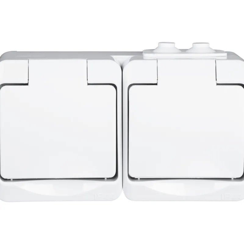 Roiskesuojattu 2-osainen pinta-asennettava pistorasia.