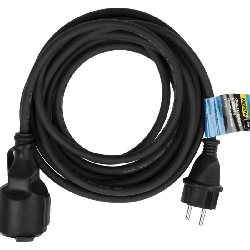 Energy+ 1-osainen kumijatkojohto sopii niin ulko- kuin sisäkäyttöön. Jatkojohto on pituudeltaan 5 m ja siinä on lapsisuojat.