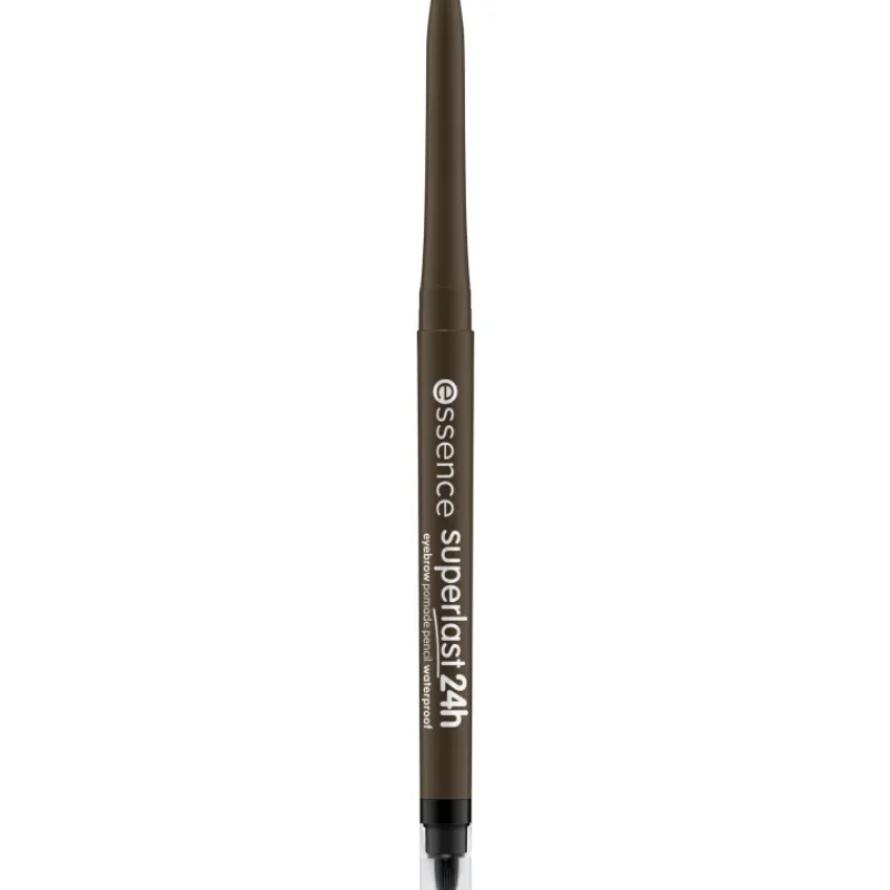 Vedenkestävä Essence Superlast 24h Eye Brow Pencil Pomade Pencil Waterproof -kulmakynä luo erittäin kestävän kulmameikin. Sen voidemainen koostumus muotoilee ja korostaa kulmia. Kynän toisessa päässä on silikonisivellin kulmameikin häivyttämiseen ja pehmentämiseen. Lisäksi kynässä on integroitu teroitin.