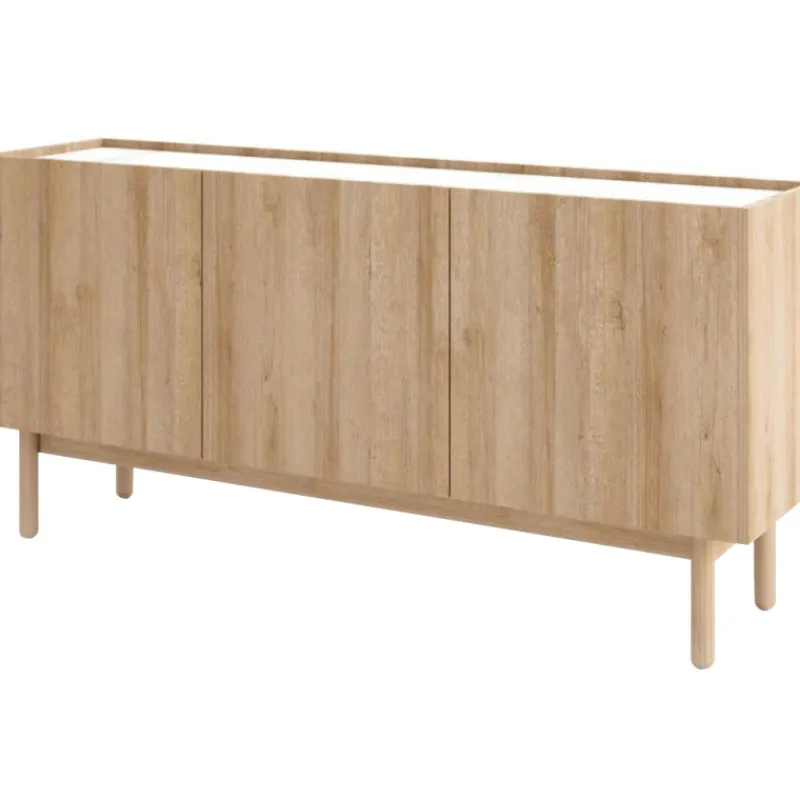 Tyylikäs Bohox-taso sisältää kolme kaappia, joissa jokaisessa on välihylly. Tammen värisen tason kaunis kansi on valkoista marmorijäljitelmälevyä. Tasossa on 16 mm laminoitu kalustelevyrunko, ABS-reunanauha sekä puiset jalat, joiden korkeus on 19,5 cm.