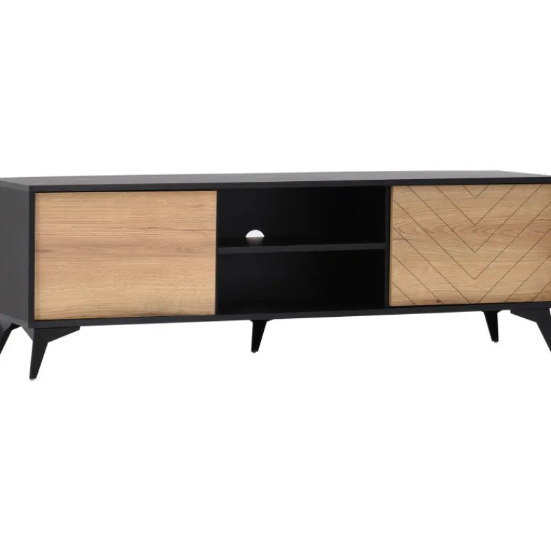 Dumont-TV-taso tuo sisustukseen tyylikkään ja näyttävän lisän. TV-tasossa on avohyllyt sekä kaksi kaappia, joiden ovissa on tammen väriset etusarjat ja push-to-open-mekanismi. Oikeanpuoleinen ovi on myös koristeltu kauniilla kuviolla.