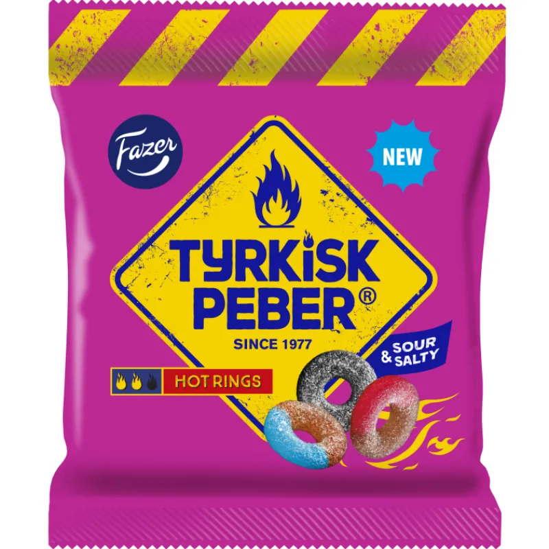 Makuhermoja kutkuttavat Tyrkisk Peber Hot Rings -turkinpippurirenkaat eivät ole kuin mikä tahansa karkki. Sekoitus sisältää kirpeitä hedelmä-lakritsin makuisia renkaita ja suolaisia salmiakkirenkaita. Kaikkia makuja yhdistää Tyrkisk Peberin sopivan ärhäkkä tulisuus!