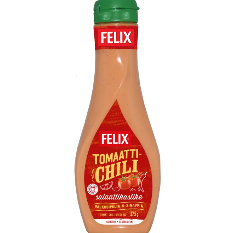 Tomaatti-Chili on Felix-sarjan suosituin salaatinkastike! Täyteläinen ja tasapainoinen salaatinkastike on maustettu tomaatilla ja chilillä. Monen mielestä se sopii parhaiten mm. kana-, tonnikala- ja pastasalaatille.