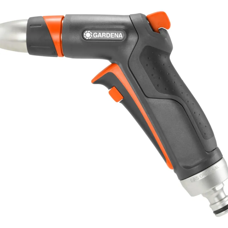 Kestävä Gardena Premium ruiskupistooli kasteluun ja puhdistamiseen. Suihkun muotoa voidaan säätää hienosta sumusta kovaan, pistemäiseen suihkuun. Ergonominen, yhdellä kädellä säädettävä. Veden virtauksen voimakkuus on säädettävissä portaattomasti. Metallinen suihkun pää ja liitin ovat todella kestäviä. Jäätymisen kestävä.