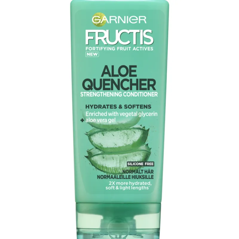 Fructis Aloe Quencher -hoitoaineen koostumuksessa yhdistyvät erittäin kosteuttava aloe vera -geeli ja luonnollista alkuperää oleva kasvisglyseroli. Normaaleille hiuksille kehitetty hoitoaine kosteuttaa, vahvistaa ja ravitsee hiuksia tehokkaasti. Hiukset tuntuvat ilmavilta, kevyiltä ja pehmeiltä! Hoitoaine kosteuttaa hiuksia tehokkaasti ja pitkäkestoisesti. Käytä hoitoainetta yhdessä Fructis Aloe Quencher -shampoon kanssa. Pakkauskoko 200 ml.