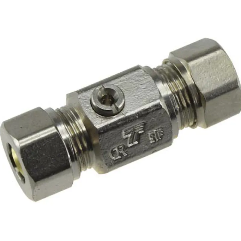 Kromattu kuulasulkuventtiili puserrusliittimillä. STF-tyyppihyväksytty.
