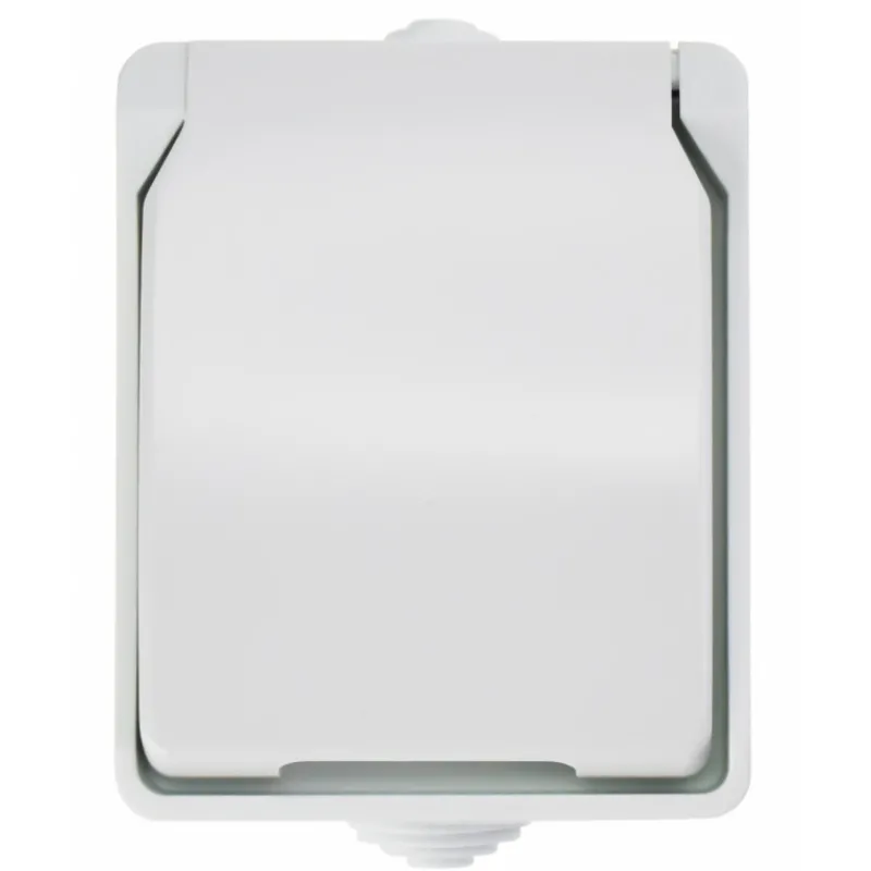Yksiosainen pinta-asennettava pistorasia. Roiskevesitiivis. Mitat: 64 x 53 x 85 mm.