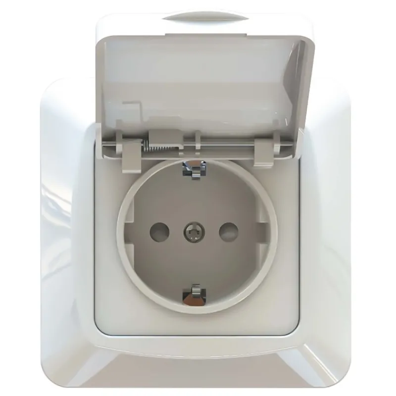 1-osainen roiskevesitiivis uppoasennettava, maadoitettu pistorasia. 16A 250VAC. Taajuus 50 Hz. Suojausluokka IP44. Materiaali PC. Ruuviliittimet.