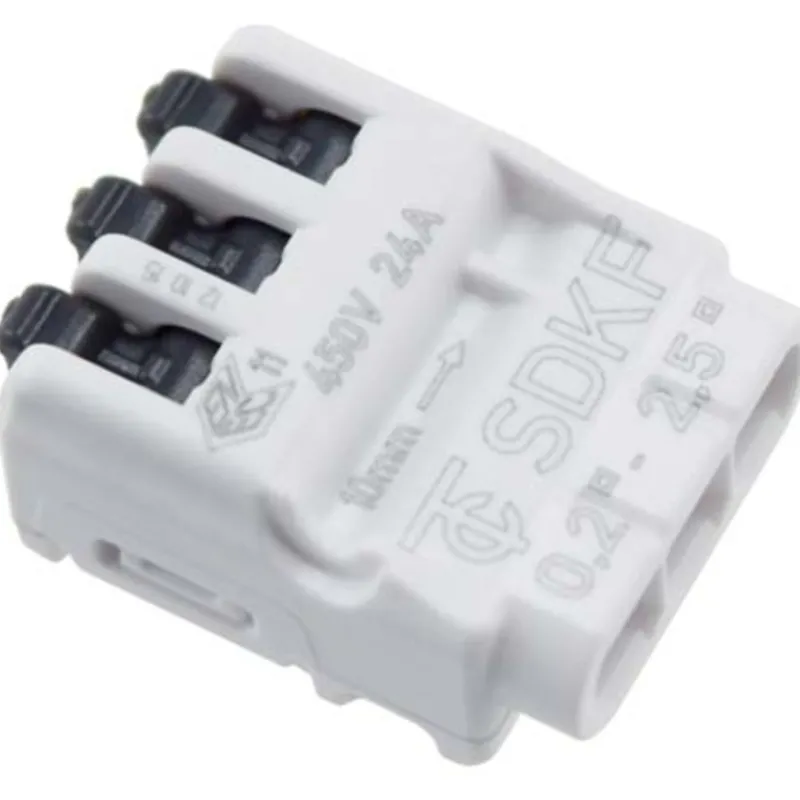 3-osainen vipuliitin. Nimellisjännite 450 V. Nimellisvirta 24 A. Max. ympäristön lämpötila T85. Johdon kuorimispituus 9 + 1 mm. Johtimen paksuus 0.2 – 2.5 mm².