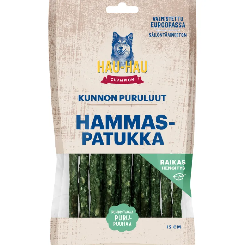 Hau-Hau Champion kunnon puruluut -sarjan hammaspatukka on maistuva ja houkuttelevan tuoksuva rouhepatukka, joka on suunniteltu koiran hampaiden hoitoon. Rouhepatukkaan lisätyt yrtit auttavat raikastamaan koiran hengitystä. Hammaspatukka sopii myös pienemmälle puruvoimalle. Patukassa on runsaasti proteiinia ja vähän rasvaa. Koiran hammaspatukatpatukat eivät sisällä lainkaan viljaa tai säilöntäaineita. Valmistettu Euroopassa.