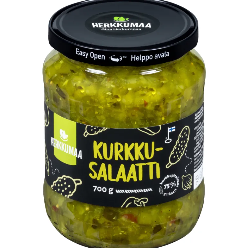 Tuoreista kurkuista valmistettu Herkkumaan kurkkusalaatti täydentää aterian. Maukas kurkkusalaatti on monikäyttöinen; nauti sellaisenaan, leivän päällä tai osana ateriaa. Pakkauskoko 700 g.