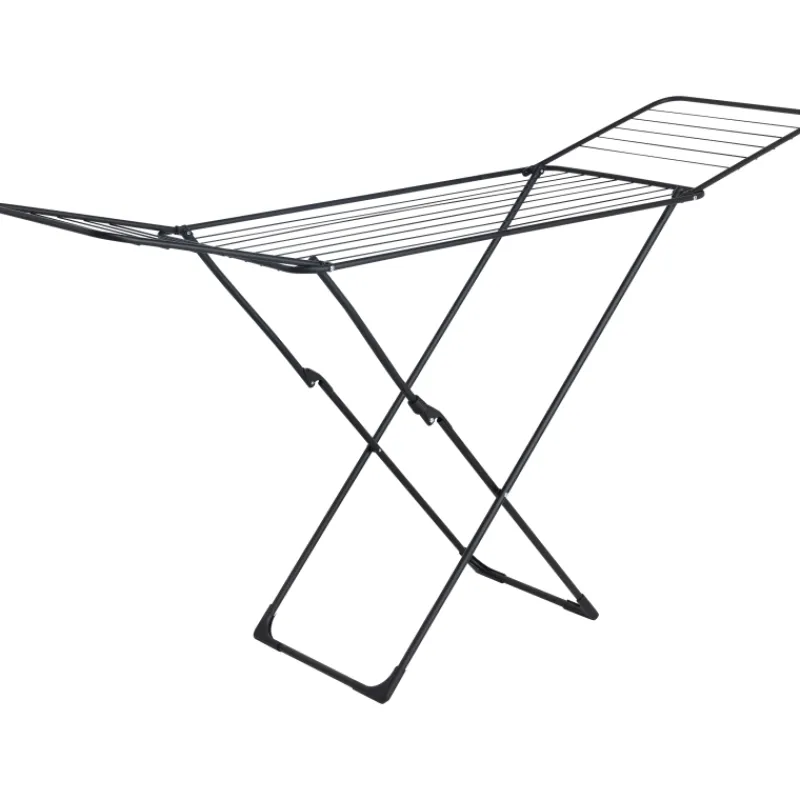 Iisi siivekkeellinen pyykkiteline on tyylikkään musta, ja siihen mahtuu jopa 16 metrin verran kuivattavia pyykkejä. Tukevassa pyykinkuivaustelineessä on siivekkeet, joilla saa lisää kuivaustilaa kätevästi.