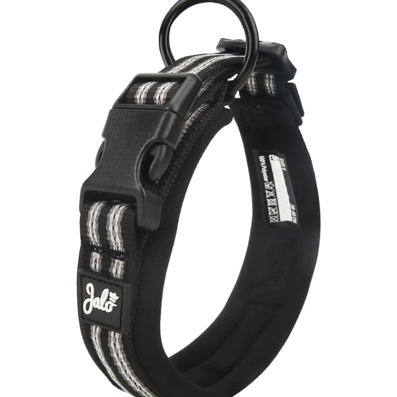Jalo koiran kaulapannassa on pehmeä neopreenipehmuste, mikä tekee pannasta miellyttävän tuntuisen. Pannassa on säädettävä pituus, muovinen kiinnityssolki ja metallinen O-rengas hihnan kiinnitykseen.