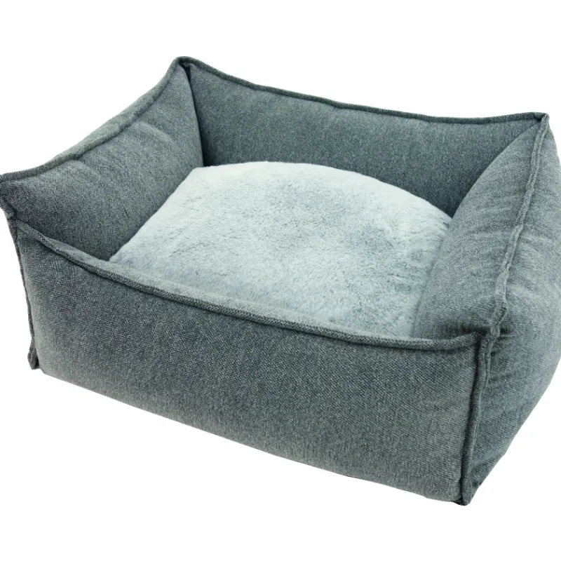 Harmaa, sohvamainen koiranpeti sopii monenlaiseen sisustukseen. Suuressa pedissä on irrotettava, kaksipuoleinen tyyny. Toinen puoli on harmaata kangasta ja toinen pehmoista pörröfleeceä.