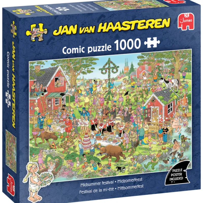 Jumbo Jan van Haasteren Midsummerfestival -palapelissä on 1000 palaa. Koko koottuna: 69 x 49 cm. Palapeli on valmistettu kierrätyspahvista.