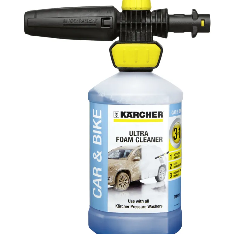 Kärcher FJ 10 C Connect ’n’ Clean vaahdotussuutin Ultra Foam Cleaner -pesuaineella. Puhdistusjärjestelmä mahdollistaa nopean vaihdon eri pesuaineiden välillä vain yhdellä klikkauksella. Pesuaineen annostelua voi säätää helposti vaahtosuuttimesta ja suihkun tasoa tarpeen mukaan. Soveltuu kaikkiin Kärcher K2-K7 -sarjan painepesureihin.