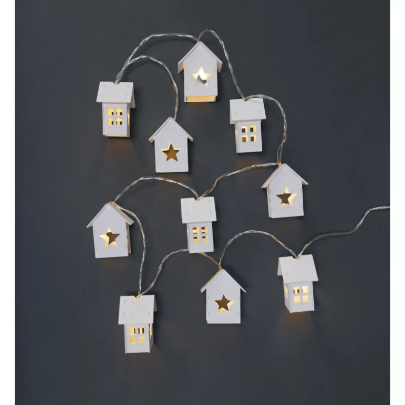 Mökki-valosarjassa on 10 lämpimän valkoista LED-valoa ja se toimii 3 x AA-paristoilla (eivät sisälly pakkaukseen). Valittavana ON/OFF- tai ajastintoiminto. Ajastin: paloaika 6 h, syttyy automaattisesti uudelleen 18 h kuluttua. Valo-osuuden pituus 135 cm. Polttimoiden väli 15 cm. Kokonaispituus 165 cm. Tuote soveltuu ainoastaan sisäkäyttöön.