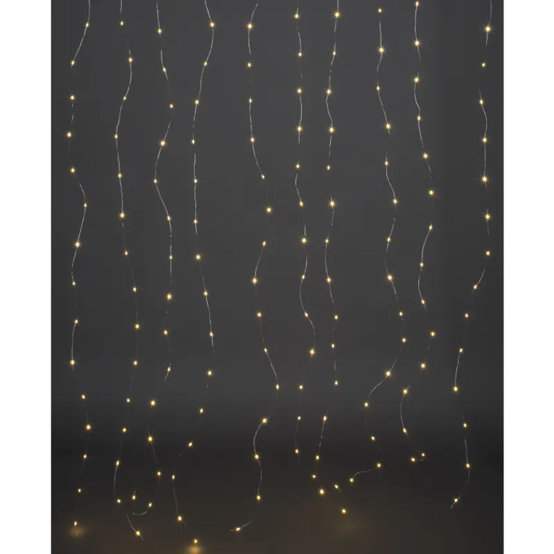 Kotikulta valoverhossa on 200 lämpimän valkoista LED-valoa. Muuntaja ulko- ja sisäkäyttöön IP44, 31 V, 3,6 W. Läpinäkyvän lähtöjohdon pituus 5 m. Valoverhon koko 2 x 2 m. Polttimoiden väli 10 cm.